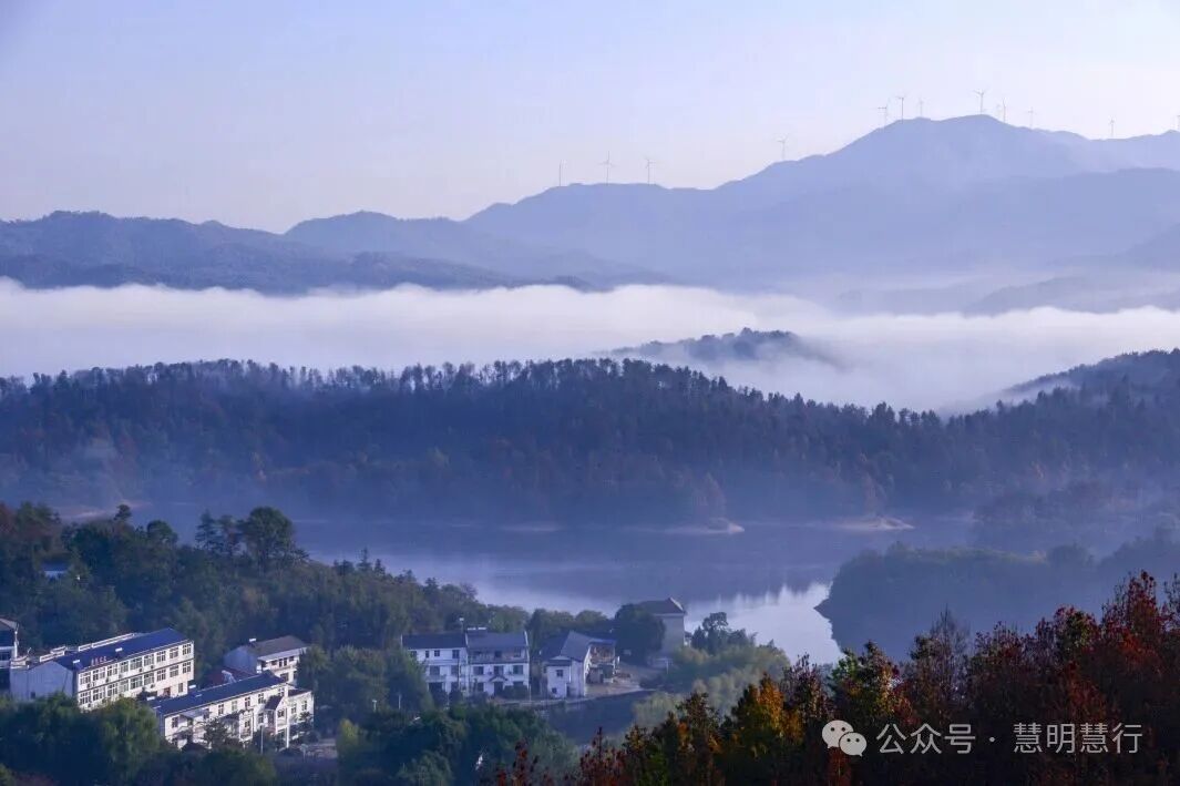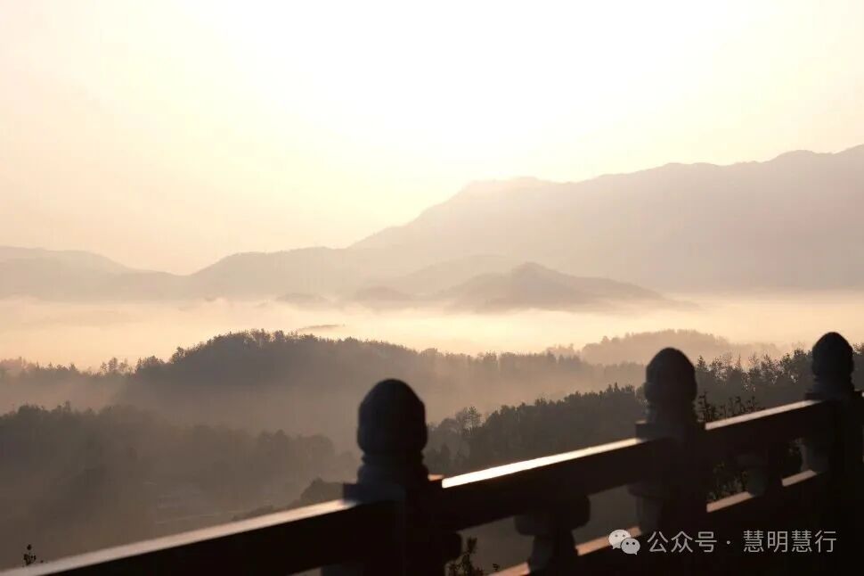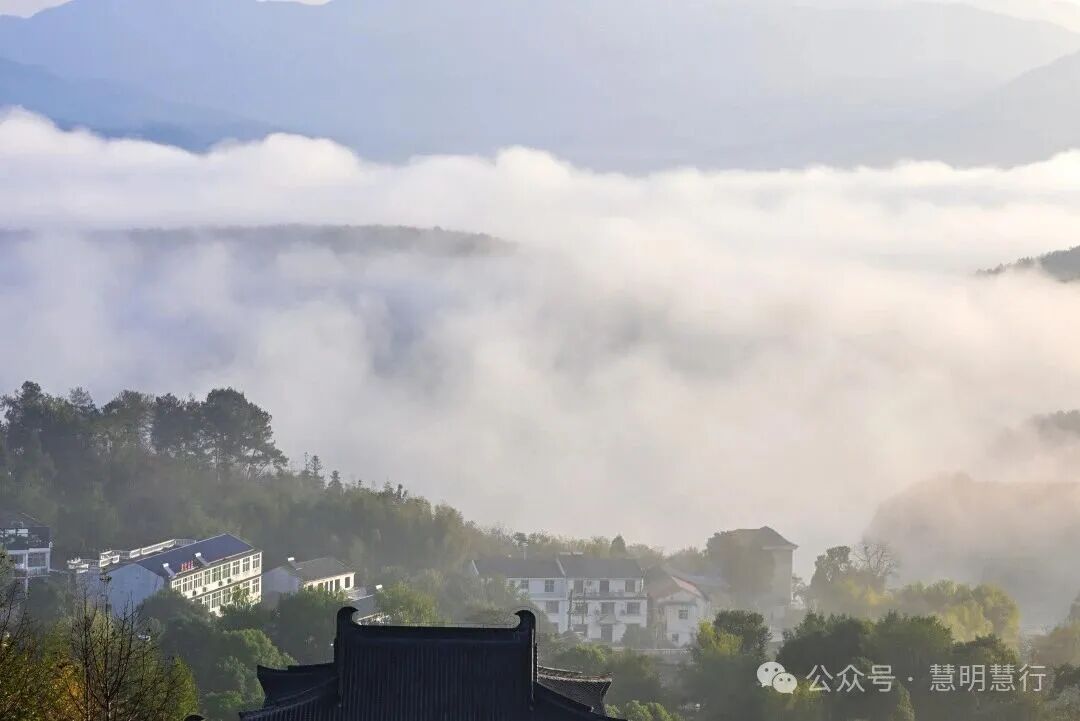 站在观景台远眺,古朴的建筑、静谧的村落与流动的云海相映成趣。