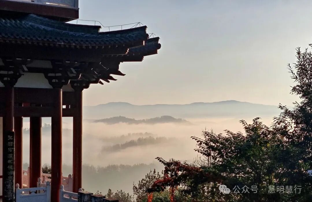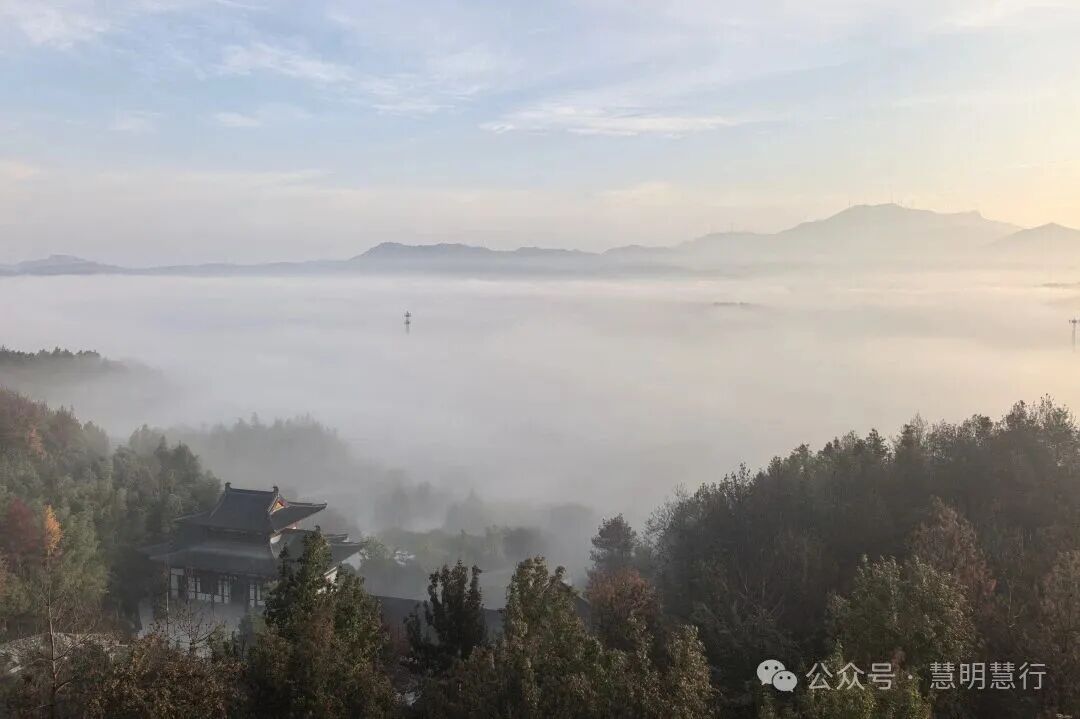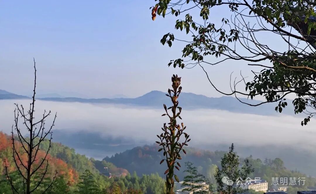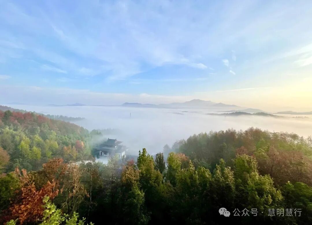 沿石阶缓步而上,远处云海翻涌,脚下落叶轻响,身边秋色环绕,耳畔鸟鸣清脆,连呼吸都带着山间的清甜。不知不觉间,便已抵达观景台。