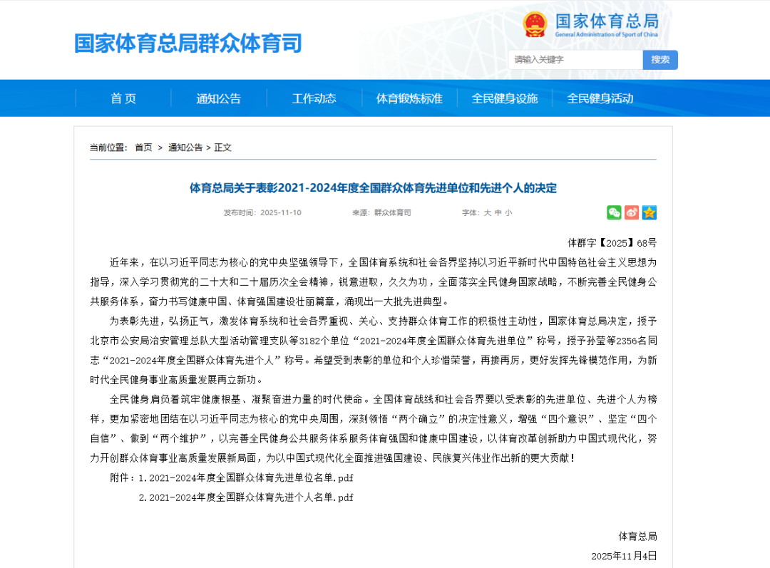 《体育总局关于表彰2021-2024年度