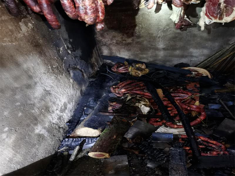 2025年12月21日,贵阳开阳硒城街道刘育村一民房因熏腊肉发生火灾,经了解,户主当天在熏腊肉期间临时外出,导致熏肉的火堆无人看管,腊肉由于长时间烘烤,油脂滴落进熏肉火堆中导致起火,火势将上方腊肉及周边其他可燃物引燃,所幸扑救及时未造成人员伤亡及更大经济损失。