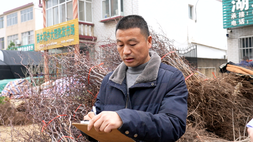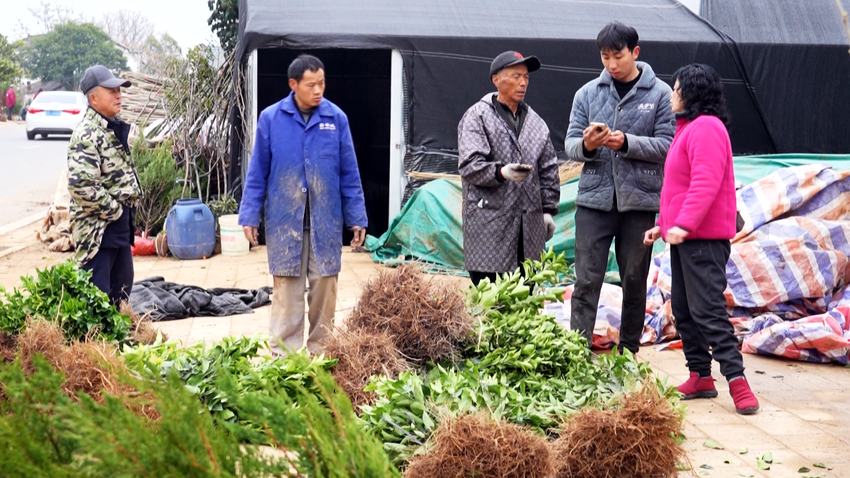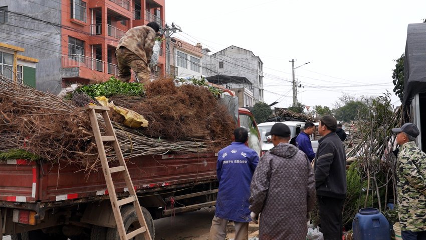 同为种植大户的周伦勇,更是忙得脚不沾地。“这段时间是我们最忙的时候,各种绿化树、果树苗需求量都很大,尤其是庭院种植的果树苗,销量最高,每天能卖出几万株,营业额有五六万元。”