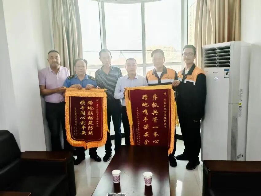 日前,武汉铁路局信阳供电段主任宋阳阳和工务段花园车间主任樊云涛一行分别为孝昌县城市管理执法局赠送“齐抓共管一条心、路地携手保安全”和“路地联动筑防线、携手同心创平安”锦旗,感谢孝昌县人民政府一直以来对铁路护路工作的大力支持。