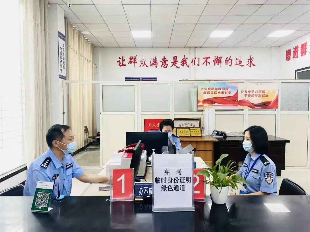 高考期间,县政务服务中心户政窗口分别在一中、二中和孟宗中学三个考点设置了“临时身份证办理绿色通道”,为高考学子全程护航,临时身份证办理由办事民警全程代跑代办并送至考生手中。