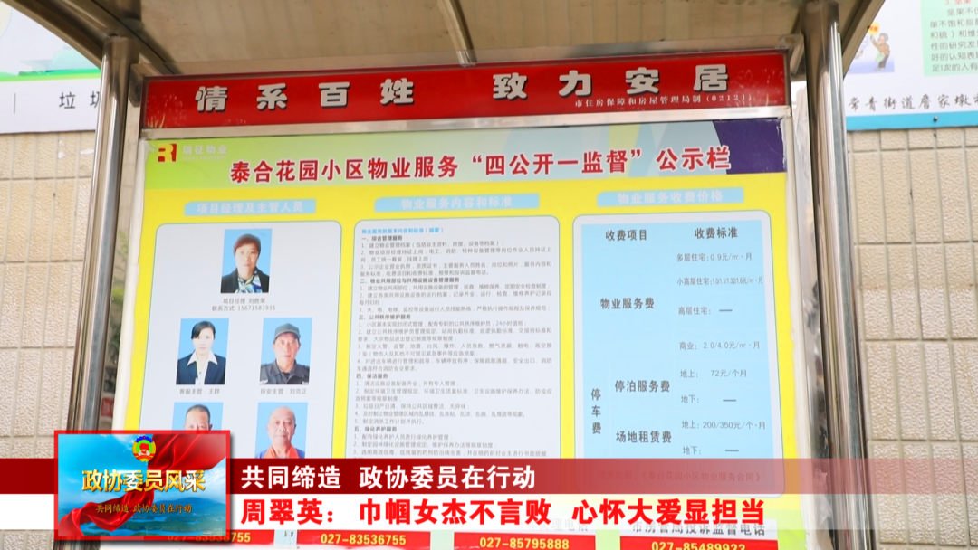 “从经济方向看,物业服务未来是一个朝阳产业,是高科技不可替代的,我就很看好这个。第二个干企业要勇于承担社会责任,特别我管的有些是老旧小区,我也比较善于和业主进行沟通,而且我很喜欢这份事业,我就坚持一直做下去了。”周翠英说。周翠英作为政协委员,她始终把深入群众、切实解决群众困难作为自己的责任。她带领团队进驻脏乱差的城中村和老旧小区,提供全面规范的物业管理服务,面对人多事杂,环境乱的泰和花园小区,她没有退缩,始终用自己的真诚和服务去感染身边的人和事,2021年泰和小区在江汉区“美丽街区”评比中名列前十位。