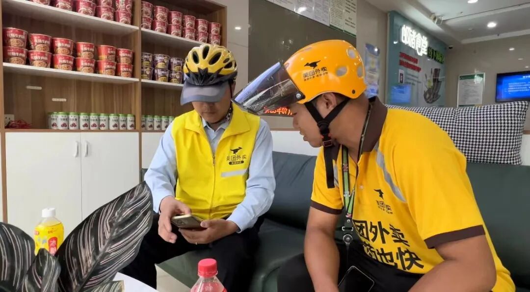 刚送完桃源社区外卖的骑手杨小兵工作间隙有了好去处,县邮储银行的“户外职工爱心驿站”成为他和同事们最常来休息、凉快的地方。