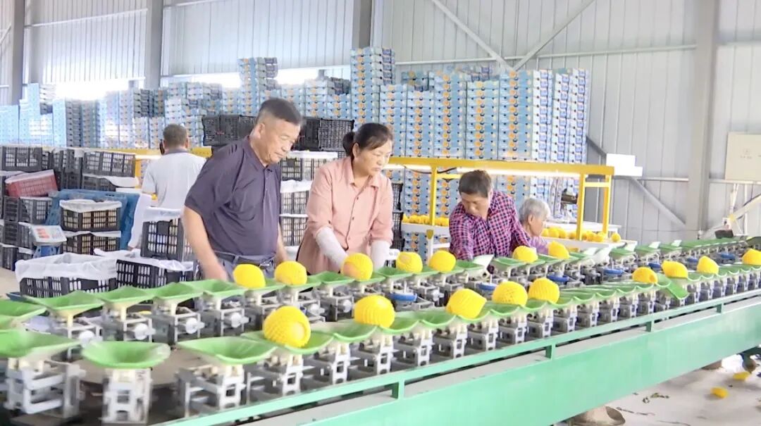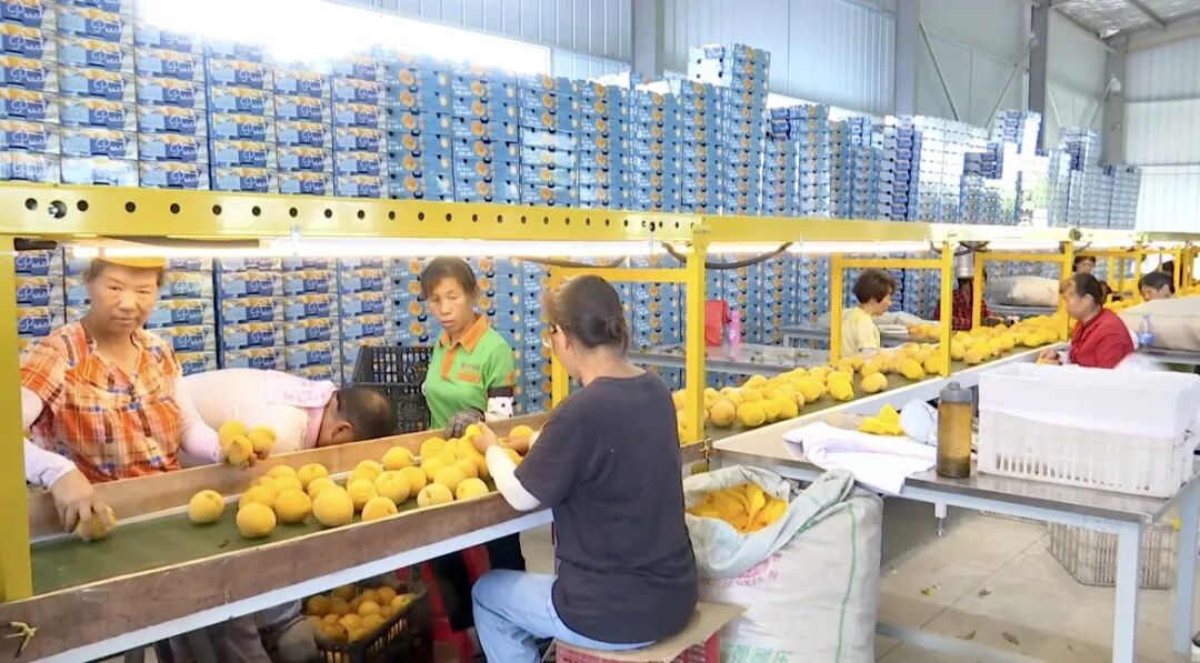 工人们将采摘好的桃子运送到仓库进行流水线分拣,按照不同的种类级别进行分类包装,以不同的价格卖到不同的消费市场中去。