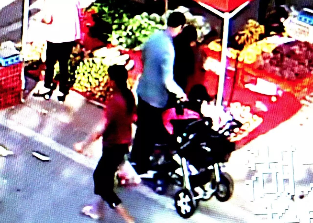 监控录像显示一名瘦长男子偷走了婴儿车上的黑色钱包