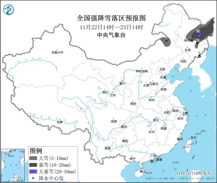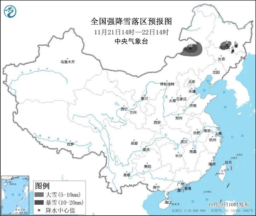 11月21日14时至22日14时,内蒙古东部、黑龙江中部偏南等地部分地区有大雪,内蒙古东部局地有暴雪(10~16毫米);上述地区新增积雪深度3~8厘米,局地可达10厘米以上。