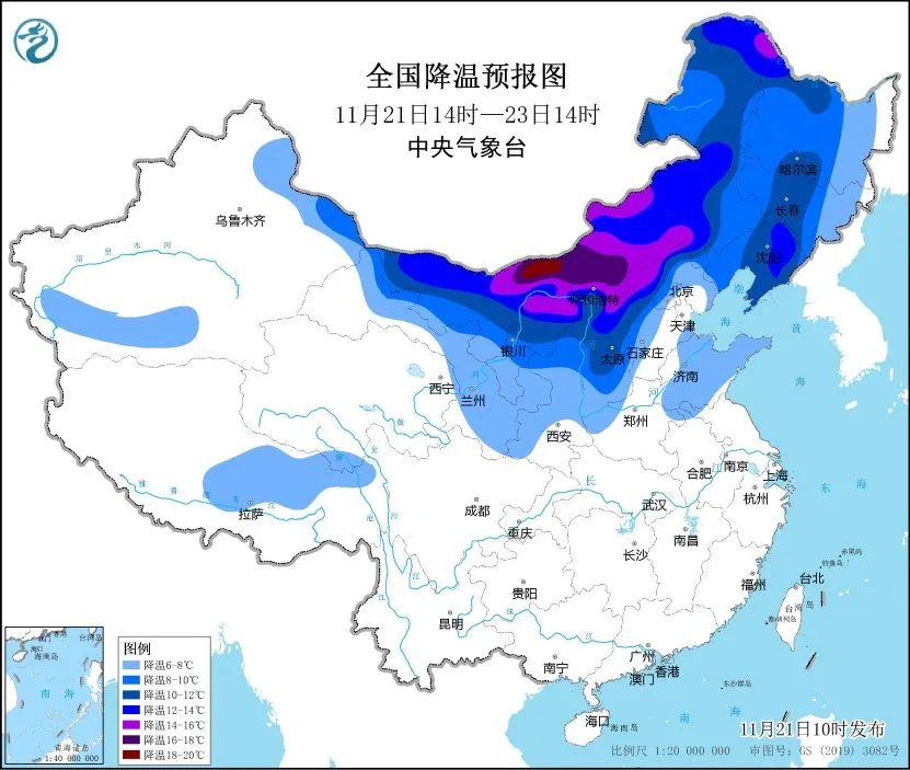 受寒潮影响,预计,11月21日午后至24日,长江中下游及以北地区气温将先后下降6~10℃,其中,内蒙古、东北地区、华北西部和北部、黄淮中东部等地降温12~16℃,内蒙古中东部、东北地区东部等地部分地区降温幅度可超过16℃,大风降温主要时段为22日至24日;寒潮影响后,最低气温0℃线将位于苏皖中北部至河南中南部、陕西南部、甘肃东南部等地,内蒙古中东部和黑龙江大部最低气温将降至-20℃以下,局地可达-30℃以下;上述大部地区伴有4~6级偏北风,阵风7~8级,局地9级;23日至25日,我国东部和南部海区也将先后出现6~8级大风,阵风9~10级。