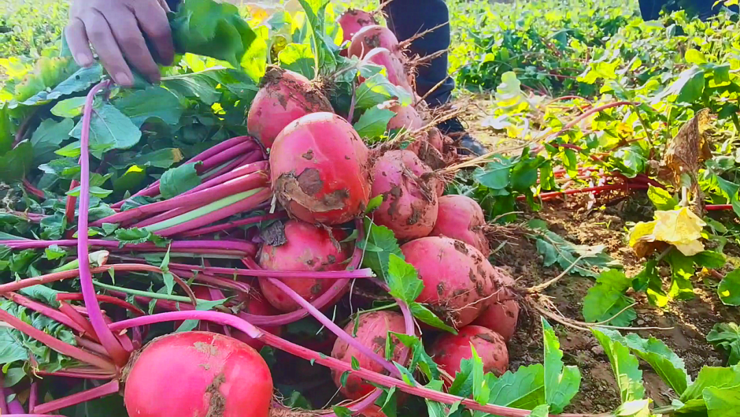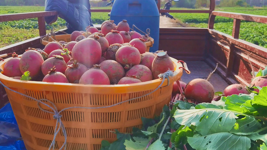 在江河村田间地头,穿着“红妆”的萝卜并排生长,农户们抢抓农时,集中采收。新鲜出土的江河萝卜体态均匀,色泽圆润,整齐地摆放在田间,为绿色田野镶嵌上了一抹丰收的景象。“今年雨水好,萝卜大丰收,又脆又甜,味道特别好。”村民宴秀平高兴地说。