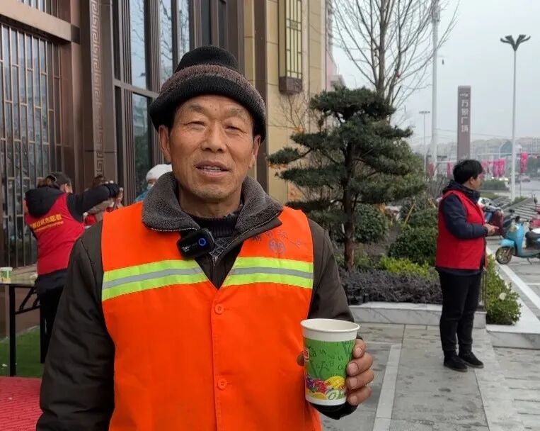 环卫工人林金堂每天早上五点钟都会骑着环卫车到达工作岗位,手持扫帚开始沿街清扫。对于今天的活动,他告诉记者,暖暖的粥不仅让身体有了暖意,更是让心也暖融融的。