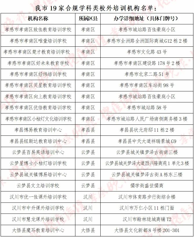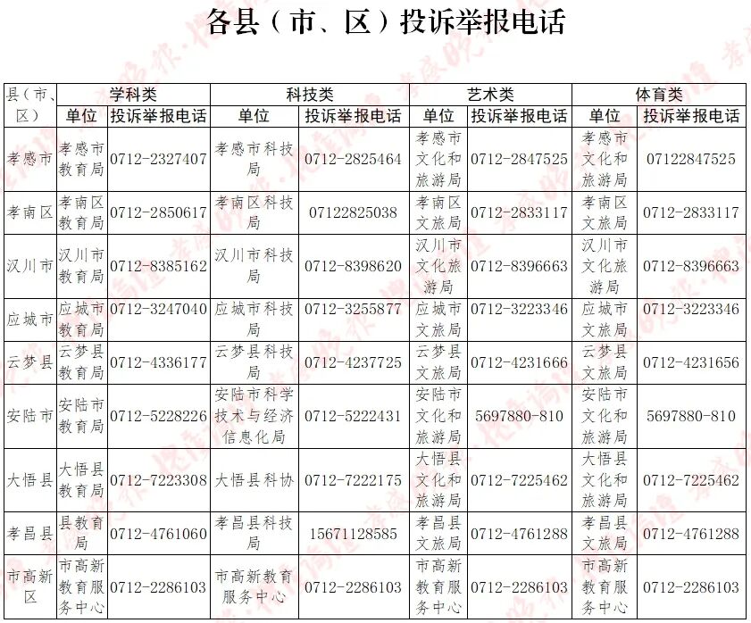 二、培训有规,遵守国家法律。《校外培训行政处罚暂行办法》已正式施行,该办法明确了擅自办班、隐形变异、违规竞赛、违规收费等校外培训违法情形的法律责任。目前,证照不齐的机构、社会组织及个人擅自开展学科类培训都属违法行为。请家长朋友们理性看待校外培训,自觉抵制违法违规学科类培训。如发现违规培训,可通过湖北省违规校外培训随手拍和全国校外培训服务监管平台(百度搜汉字即可查到)实时举报,也可以拨打各地主管部门投诉电话(举报电话见附件)。