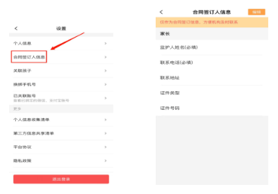 点击“设置”→点击“合同签订人信息”→点击“编辑”→输入监护人姓名、联系电话、联系地址、选择证件、输入证件号码、点击“提交”。