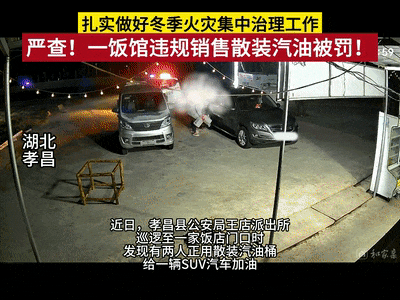 近日,孝昌县公安局王店派出所在107国道附近巡逻时,发现国道旁的某饭馆门前,有两人正用散装汽油桶给一辆SUV汽车加油。民警随即停下车辆上前检查,其中一男子发现警车之后,迅速提起汽油桶往身后的店里跑。