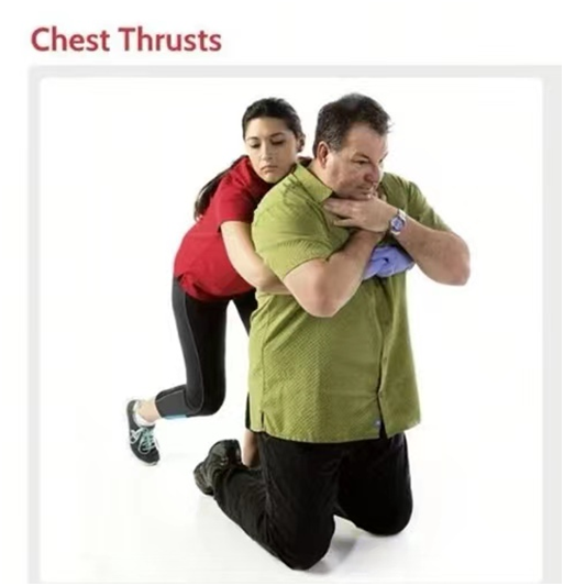 5.如果患者肥胖或者怀孕,实施胸部冲击法取代腹部冲击法:此时施救者手的位置放在前胸中央实施胸部冲击。