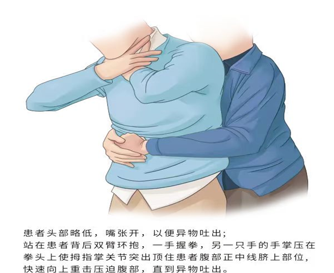 一手握拳,将拳头的拇指一侧放在患者胸廓以下和脐以上之间的腹部;另一手抓拳,快速向上反复冲击压迫腹部,直到异物排出。