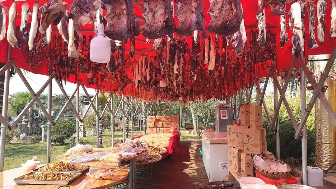 走进孝昌县周巷镇梦里周庄农家乐,只见负责人周伦武正在晒场上为游客打包晒好的腊肉、香肠等腊味年货,一架架经过风吹日晒的腊货在阳光的照射下泛着诱人的光泽,整个晒场腊味飘香。