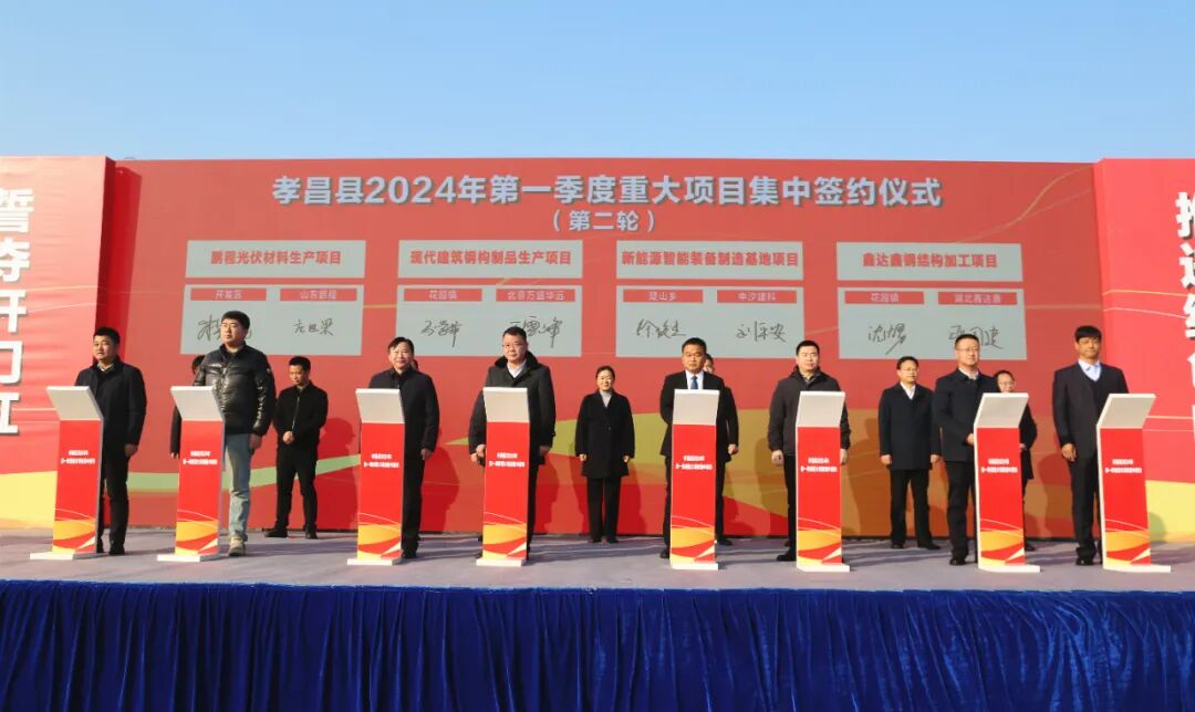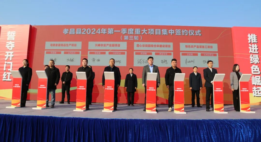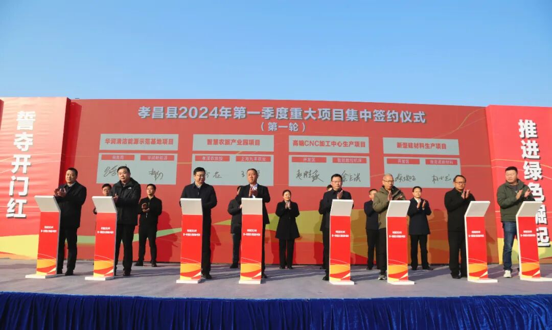 1月28日,孝昌县举行2024年第一季度重大项目集中签约暨集中开工仪式。仪式上,集中签约项目12个、协议引资总额135.63亿元,集中开工项目31个,总投资82.4亿元,涵盖了产业发展、社会民生、现代农业、基础设施等多个领域,协议引资额度、集中开工个数和总投资均创历史新高。