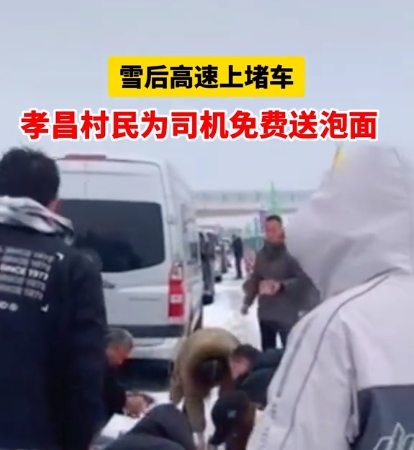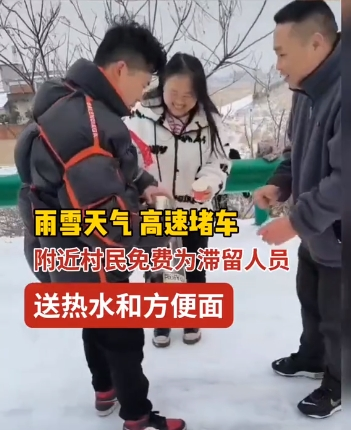 王店镇东河村村干部黄裕珍发现受困返乡群众后,与村里十余名党员村民自发组织起来,在村里小卖部就近购买了仅剩的两箱泡面,带着十几壶自家烧开的饮用水,顶风冒雪分发给滞留在高速路上的返乡人员。