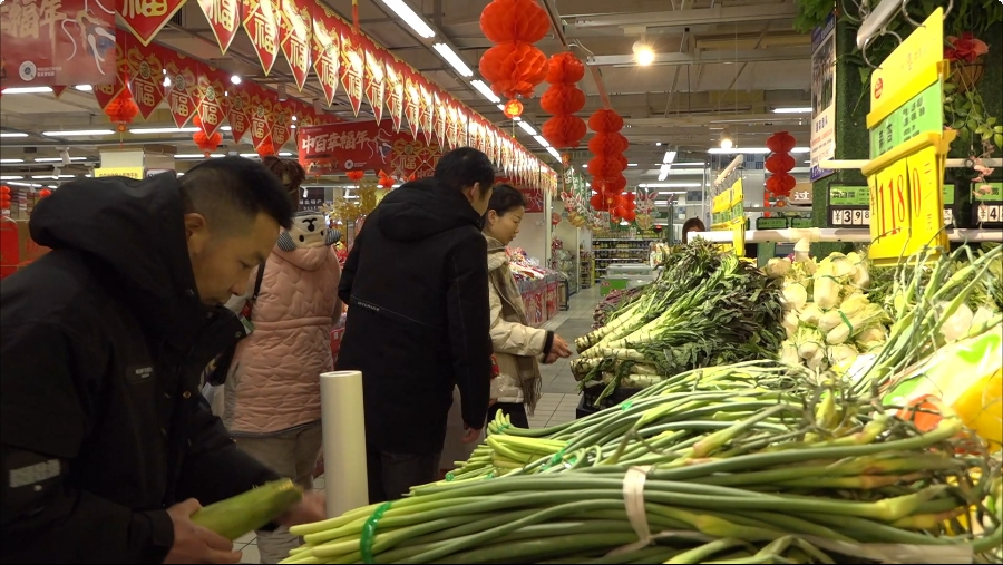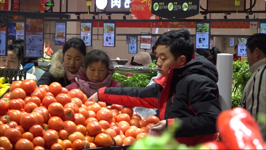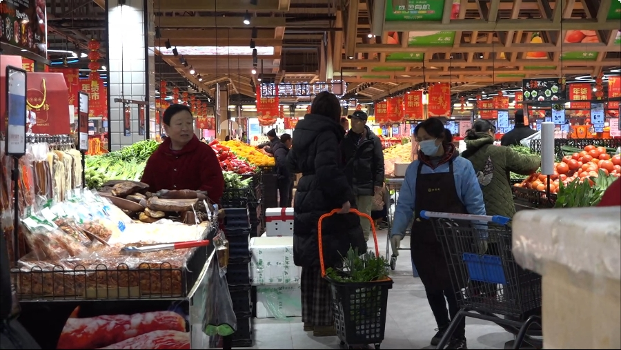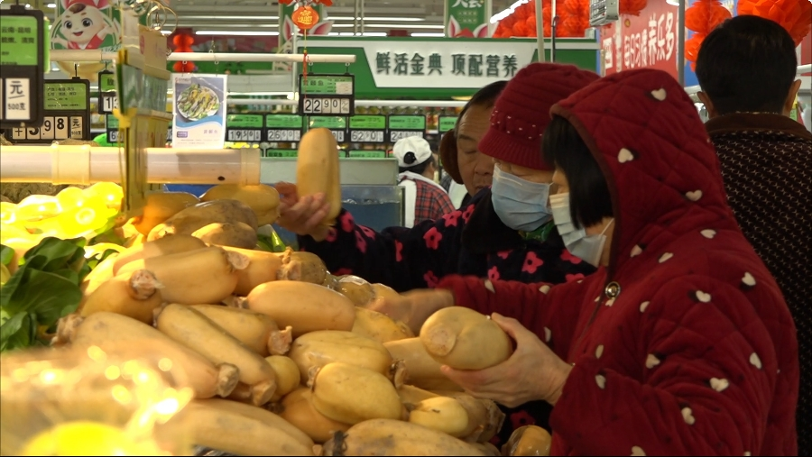 伴随着热闹的人声、商超的广播声,市民张女士穿梭在商超的各个货架前选购春节所需物资。