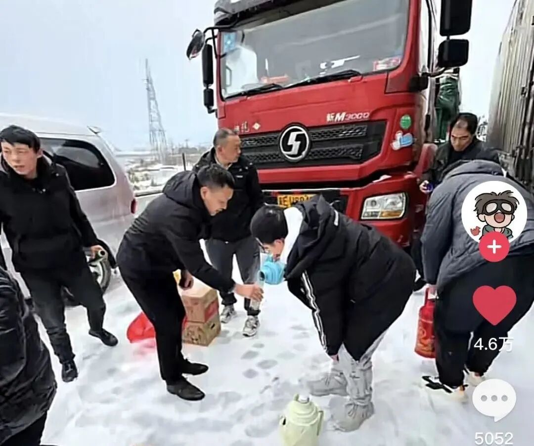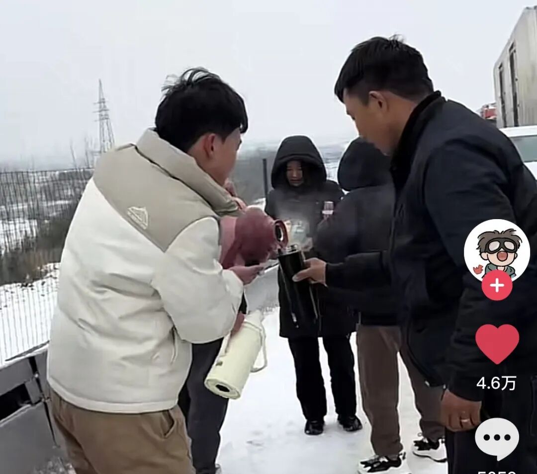 第一位司机朋友被他们的热情和善意打动了,接着,更多的朋友下车了,两人带来的热水很快分发完毕。