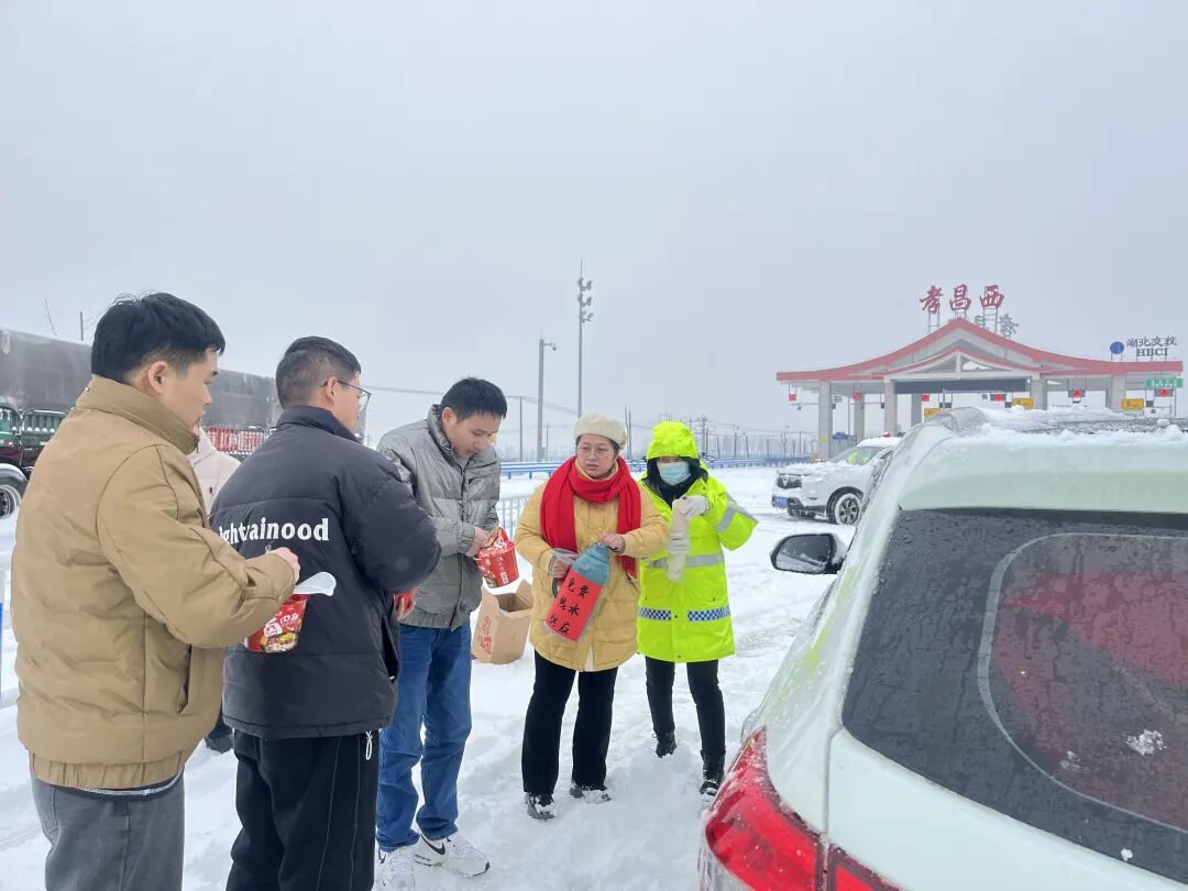 2月2日,由于受雨雪冰冻天气影响,孝洪高速孝昌西收费站入口车道实行临时交通管制,收费广场排满了焦急等待通行的车辆。花西乡、季店乡服务专班人员和孝昌西收费站工作人员一边积极安抚司乘人员情绪,一边化身服务员,将一份份热气腾腾的免费食品送到司乘人员手中。