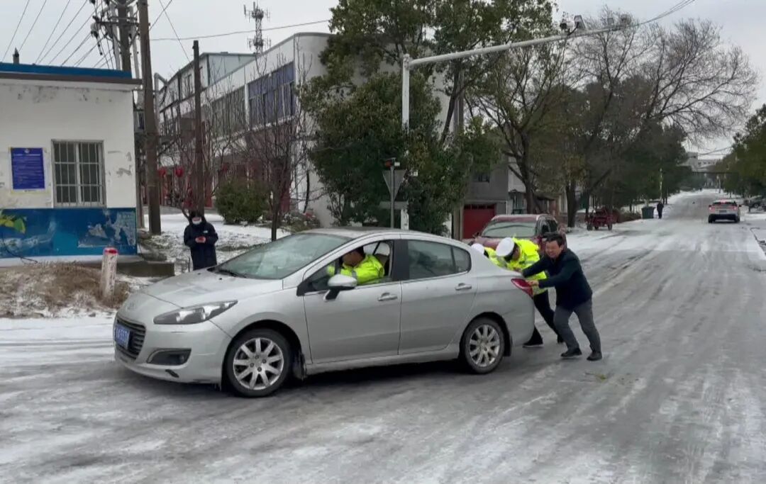 大风卷着冰碴落在孝昌的大街小巷,致使道路湿滑难行。正在107国道陡山服务站执勤的辅警殷佳伟发现有几辆车在坡道上前轮空转,汽车就是不动。殷佳伟和同事便化身“推车侠”,成功帮助司乘人员和车辆脱困。