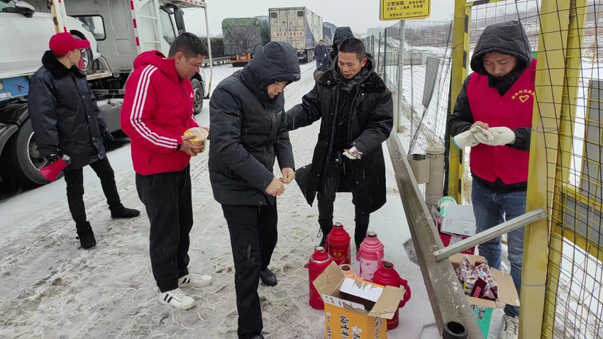 “车上带的食物已经吃完了,正发愁怎么办,你们就来了!”2月22日清晨7时,孝昌县陡山乡党员干部及志愿者为临时停靠在京港澳高速的司乘人员送去食物和热水,接到热气腾腾的面时,司机张先生十分感动。