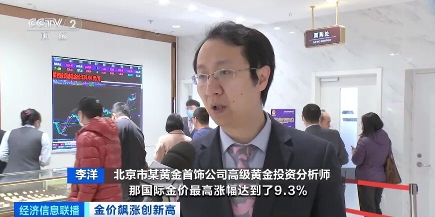 北京市某黄金首饰公司高级黄金投资分析师李洋介绍:从今年三月份开始,国际金价最高涨幅达到了9.3%,从国内价格来看,整个三月份,国内金价每克上涨了将近50元,涨幅达到了10%,周五(3月29日)这一天,国内的黄金价格每克涨了11元至12元。