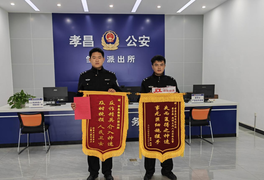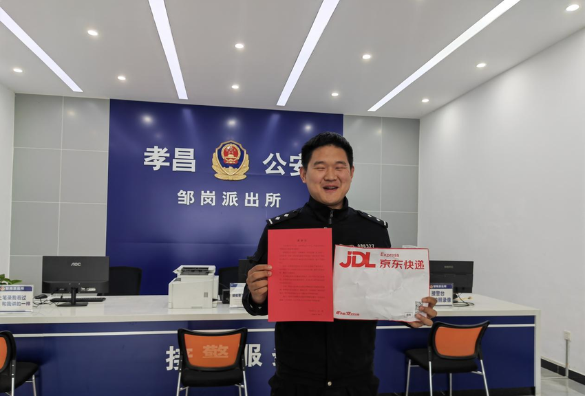 日前,孝昌县公安局邹岗派出所收到了一封来自200多公里外的感谢信、一面印有“反诈精英介入神速 及时挽损人民卫士”的锦旗,感谢邹岗派出所民辅警全力为其挽回遭遇电信诈骗损失的40万元。