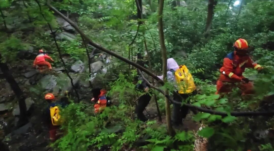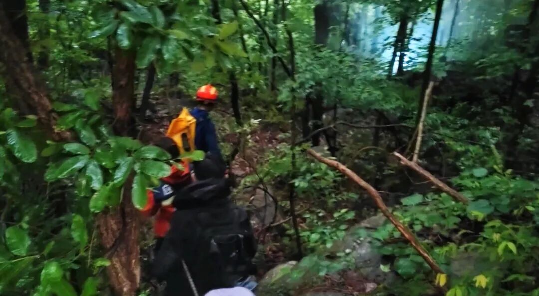 通过被困人员提供的定位信息、徒步轨迹和现场照片等信息,消防救援人员推断出被困人员的大致位置后,组成2个救援分队分别从山顶和山脚向被困区域进行搜救。