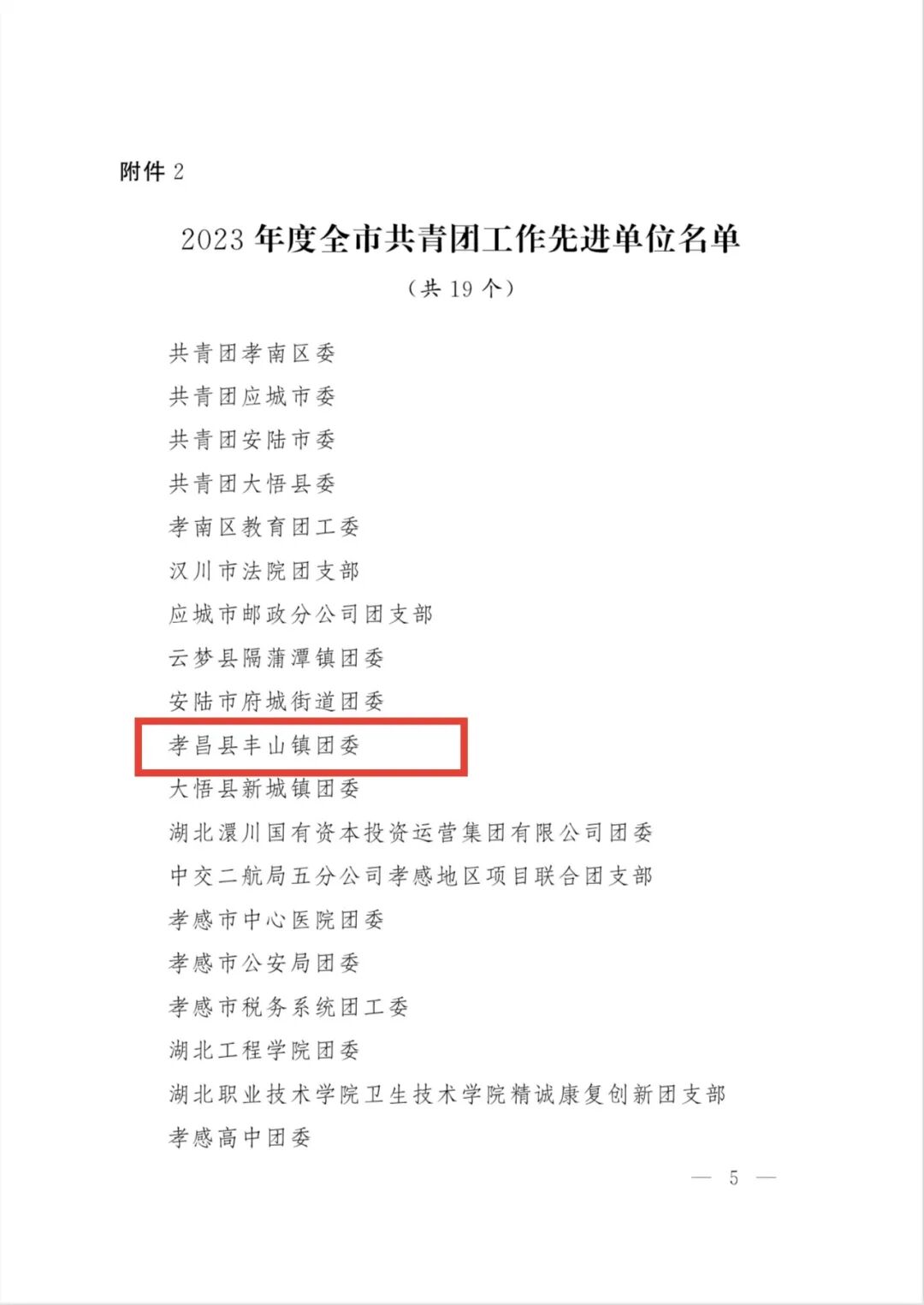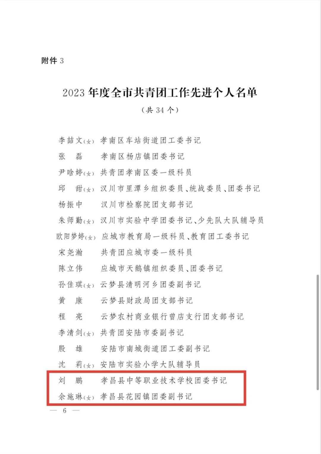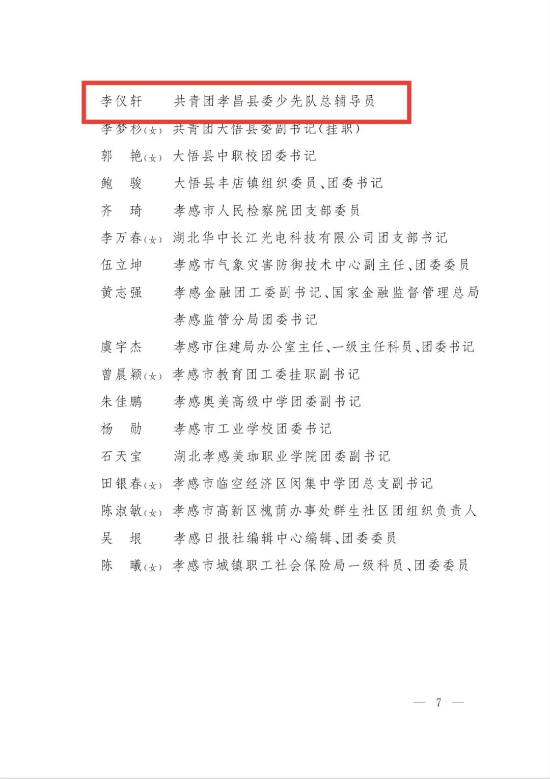 近日,共青团孝感市委印发《关于通报表扬2023年度全市共青团工作先进单位和先进个人的通知》,七仙红程琪荣获全国乡村振兴青年先锋称号,共青团孝昌县委获评全省共青团工作先进单位,孝昌县丰山镇团委获评全市共青团工作先进单位,共青团孝昌县委少先队总辅导员李仪轩、孝昌县中等职业技术学校团委书记刘鹏、孝昌县花园镇团委副书记余施琳获评全市共青团工作先进个人。