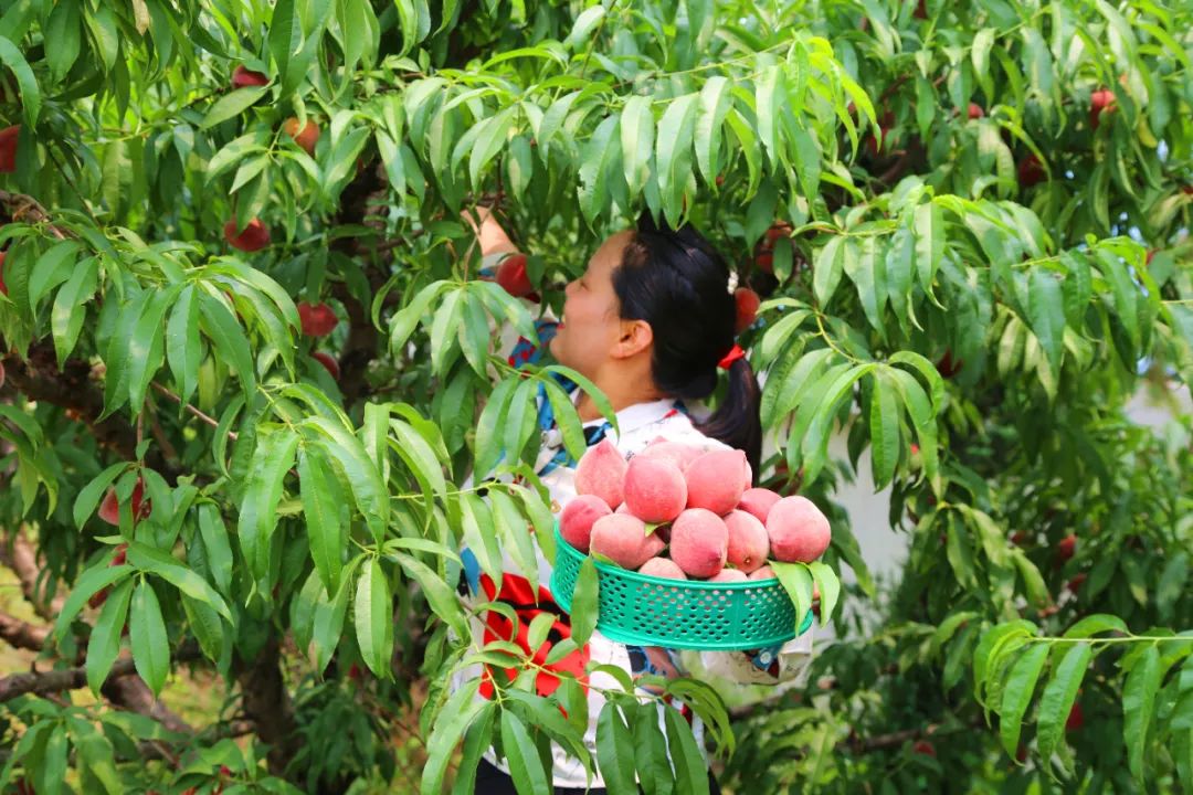 在位于“孝昌血桃”主产区——孝昌县丰山镇祝河村,放眼望去,漫山遍野的桃树郁郁葱葱,桃叶随风摆动,果实挂满枝头,颇有世外桃源之感。绿树掩映下,三五游客穿梭其中,体验采摘乐趣。