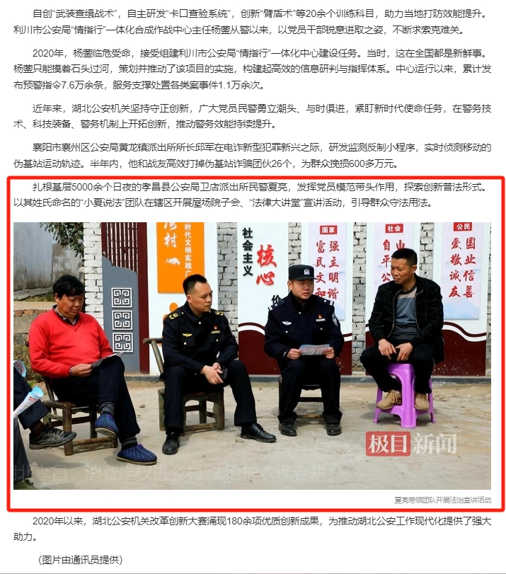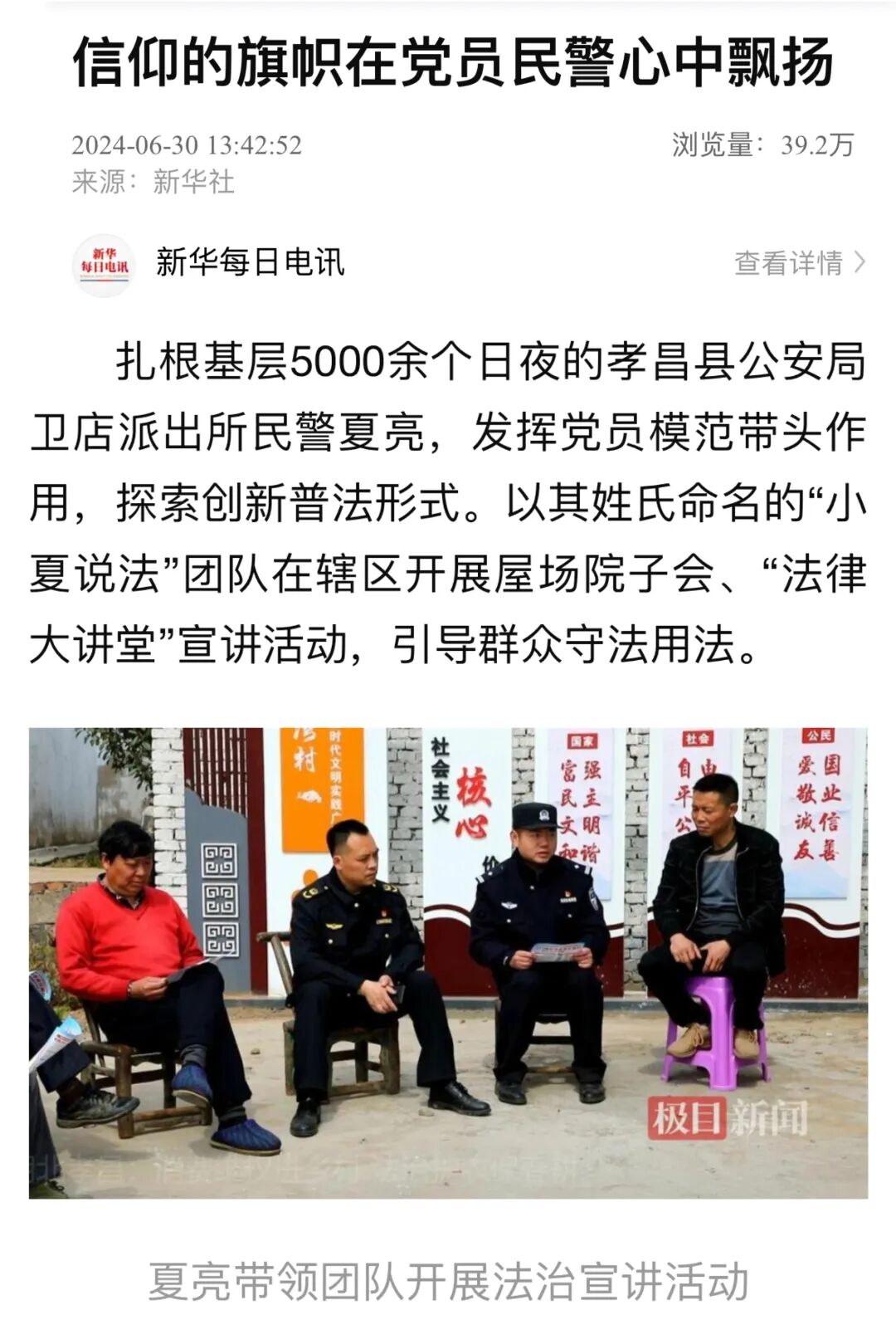 “小夏”是孝昌县公安局卫店派出所民警夏亮。2022年1月,卫店镇组织公安、司法、信访、国土、市场监管等执法力量,成立“小夏说法”调解室,坚持和发展新时代“枫桥经验”,探索分级办理、多元化解、综合调处的矛盾纠纷化解模式。