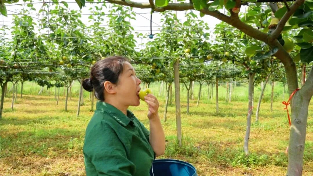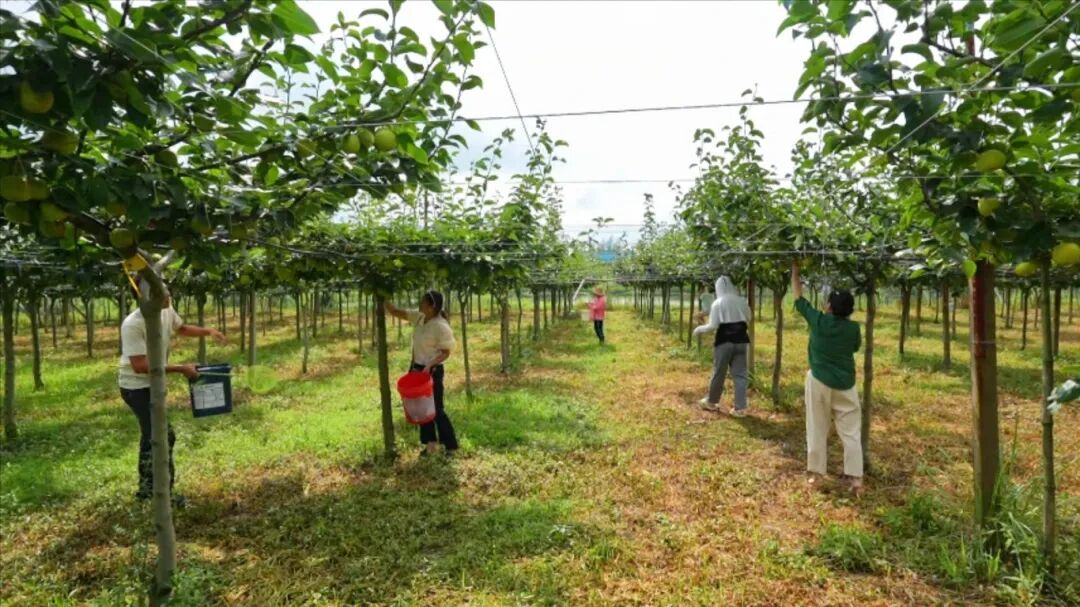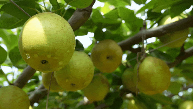 梨园里披黄挂绿的果实沉甸甸地挂满枝头,一颗颗诱人的梨儿触手可及,让人垂涎欲滴。市民们徜徉在梨树下,随手摘下一个,咬上一口,梨汁充满口腔、清甜水润。不少游客在此品尝、购买,体验采摘乐趣。