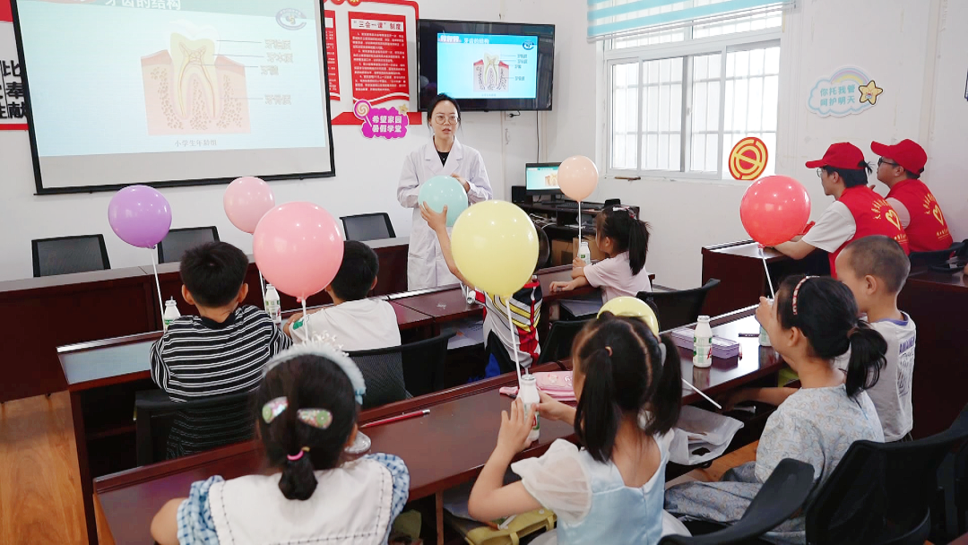 在小悟乡万冲村爱心托管班上,来自湖北职业技术学院口腔医学院的志愿者向孩子们详细讲解牙齿的结构,用一个个生活中的小案例介绍了保护牙齿的方法。有趣的问答互动,让孩子们懂得了爱护牙齿的重要性。