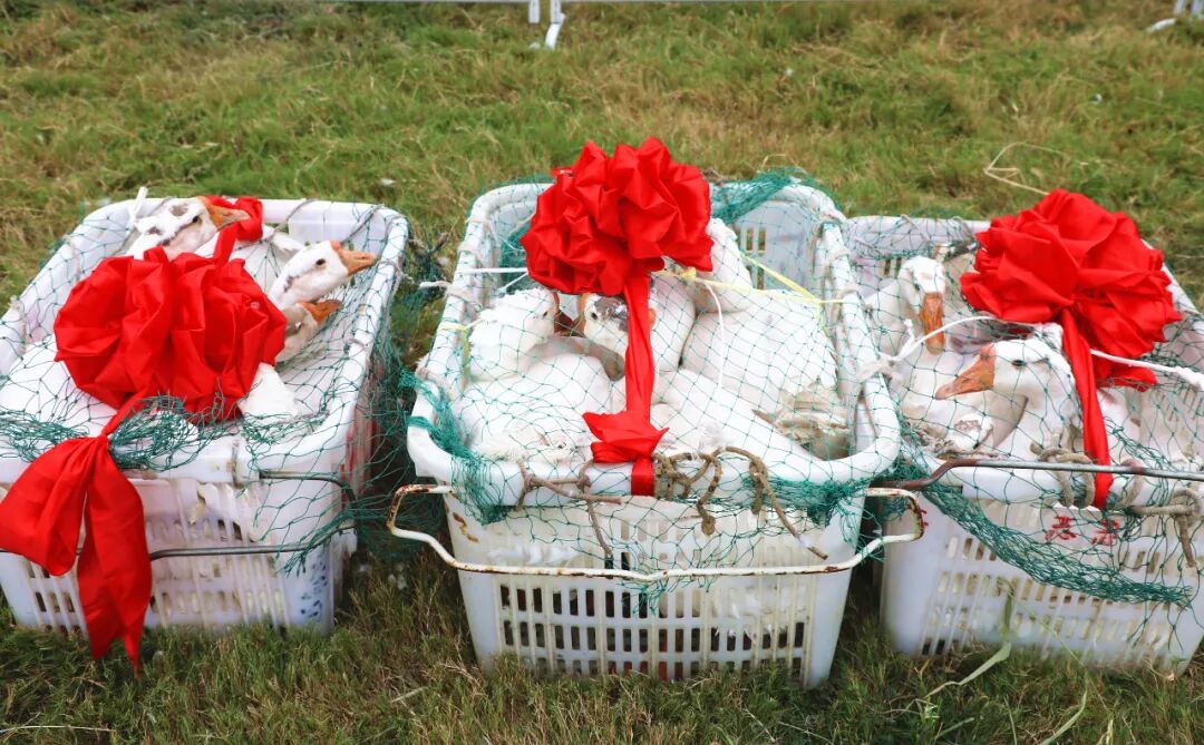 “它来了,它来了,他牵着牛羊走来了……”作为本次活动的重头戏之一,“新时代农民致富带头人”的颁奖十分抢眼,一等奖获得者直接牵走了一头牛,二等奖带走了一只羊,三等奖拉走了一筐大鹅,现场“农”味十足、热闹欢腾,大家沉浸在热闹的丰收节氛围之中。