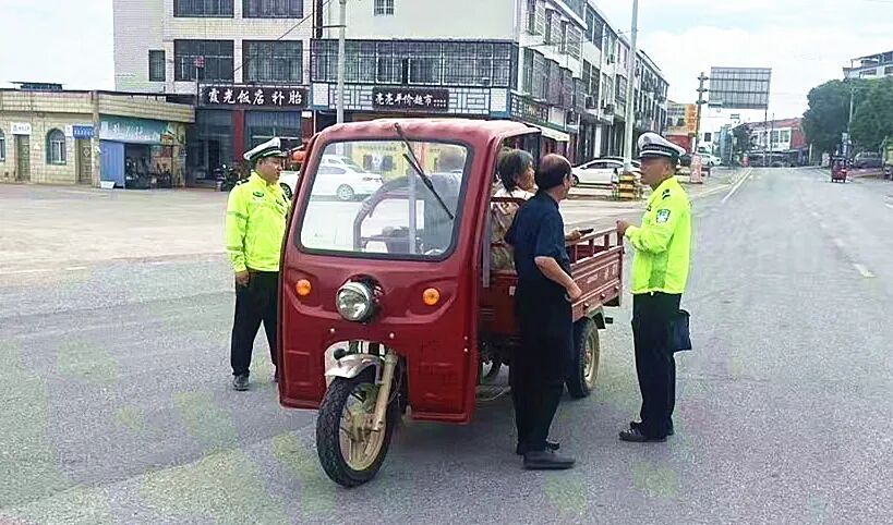 交警对无牌无照机动三轮车主进行批评教育