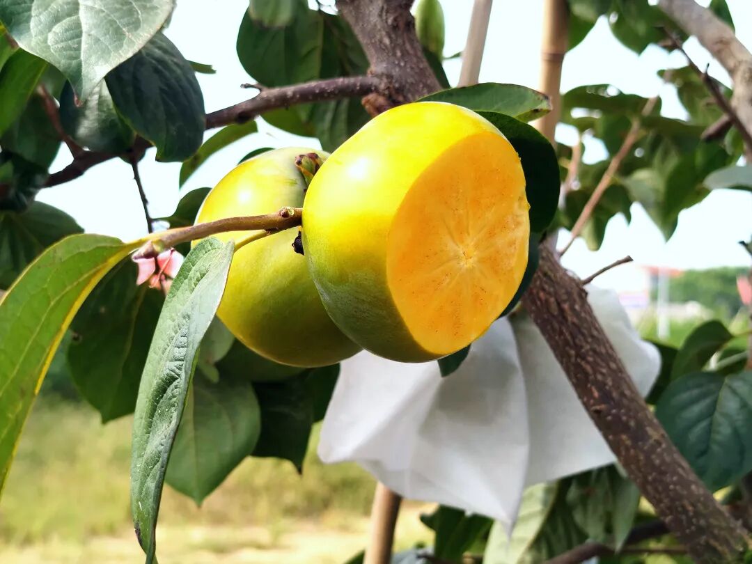 果实呈扁圆形,果肉为橙黄色,咬一口脆甜多汁……作为柿子界的“天花板”,“太秋”甜柿有着苹果的脆、哈密瓜的甜、梨的水分、柿子的香味。不同于普通的柿子需要进行脱涩处理才能食用,“太秋”甜柿从树上摘下即可食用。