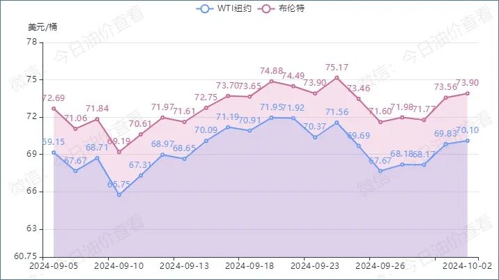 【国际油价】国际油价10月2日上涨。截至当天收盘,纽约商品交易所11月交货的轻质原油期货价格上涨27美分,收于每桶70.10美元,涨幅为0.39%;12月交货的伦敦布伦特原油期货价格上涨34美分,收于每桶73.90美元,涨幅为0.46%。