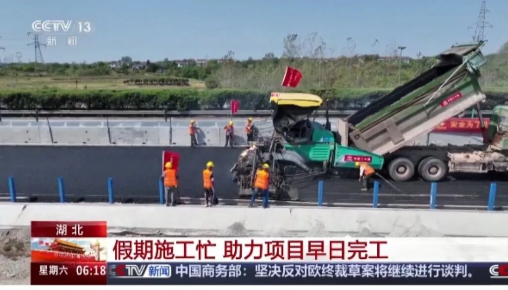 在孝昌境内的京港澳高速公路湖北段改扩建工地上,工人们正在加紧施工,他们要先给路面摊铺沥青,然后再进行碾压。