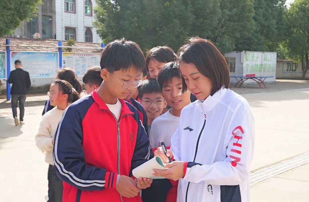 在示范互动环节,赵芸蕾耐心细致地进行现场教学,从如何击球、发力、站位、战术、团队配合等方面,一对一指导和纠正学生们打球的动作,并为现场师生发放签名卡,共同合影留念。