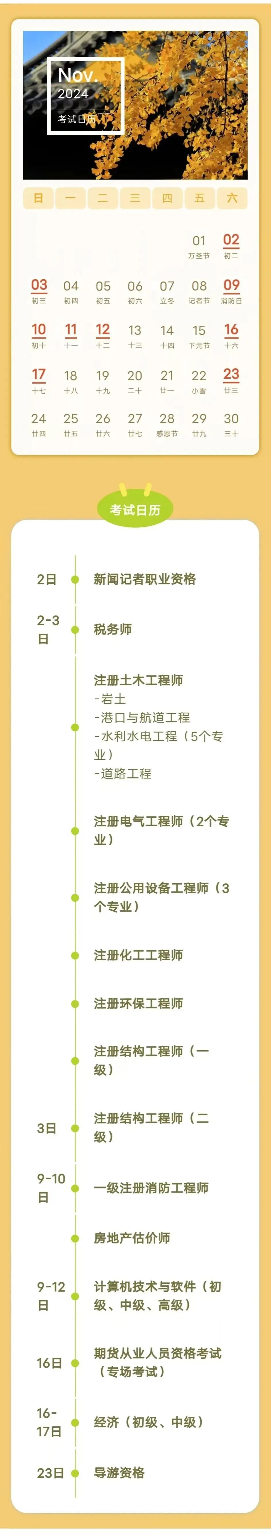 11月有这些考试,别错过→ 2024-11-02 10:22 0 要考证的小伙伴看过来 11月专业技术人员职业资格考试 时间表来了↓↓↓ 祝大家都能 顺利通过考试! 来源:人力资源和社会保障部、湖北发布