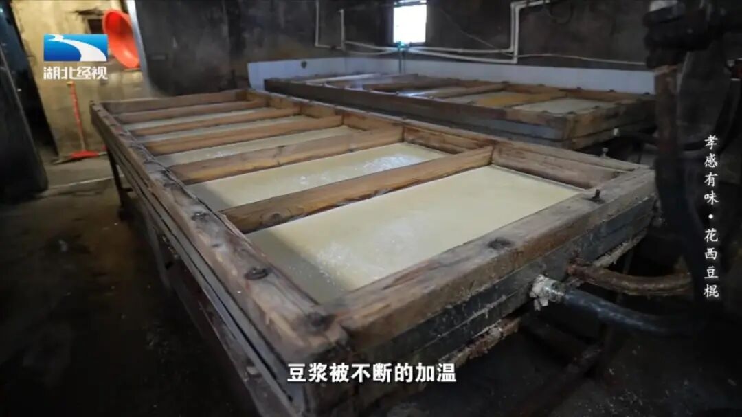 黄豆被磨成细腻的豆浆之后,还要煮开,然后被倒入特制的蒸床上。豆浆被不断地加温,表面逐渐形成薄薄的一层皮。