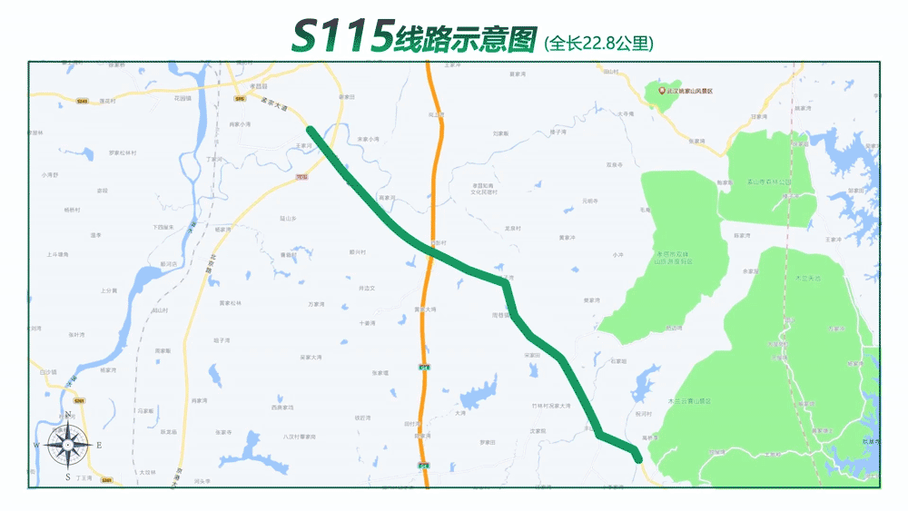 S115省道路长制示范线全长22.8公里,起于孝昌县城区东部王河大桥,止于武汉市黄陂区祁泡线,是孝昌全面融入武汉都市圈的重点交通同网工程,也是孝昌全域旅游和苗木、果茶特色产业发展的重要经济轴线。