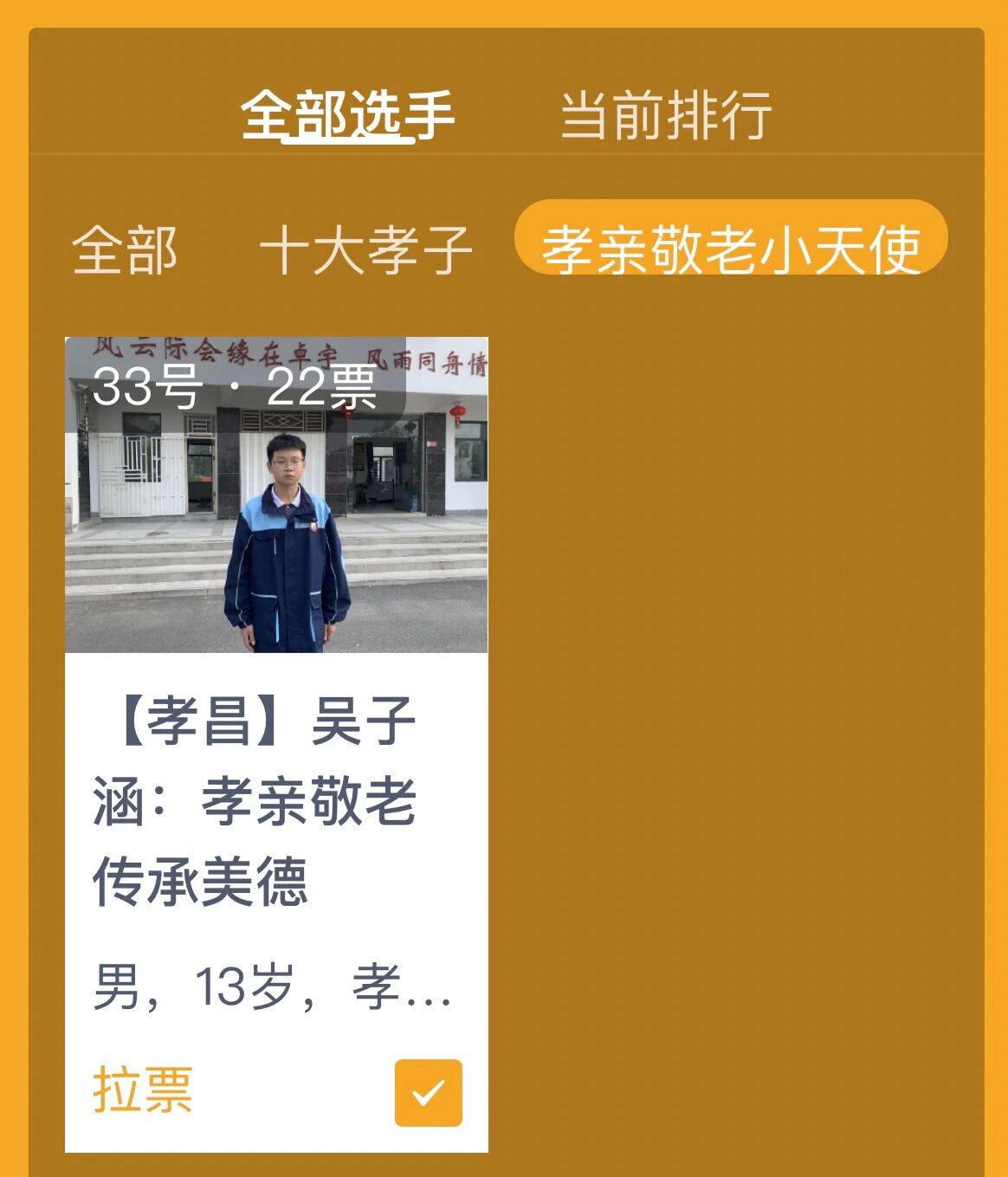 经过层层推荐、实地考察、媒体宣传,现进入投票阶段,请你为你心中的“孝亲敬老小天使”投上神圣的一票。