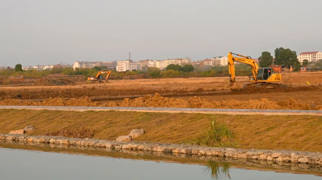中贝建设有限公司项目现场负责人杨齐介绍,目前正在进行土地平整和坑塘清淤工作。为了不影响明年春播,已调动25台挖掘机和10台推土机进场施工,下一步将进行田间道路和灌溉排水工程施工,预计2025年4月全部完工。