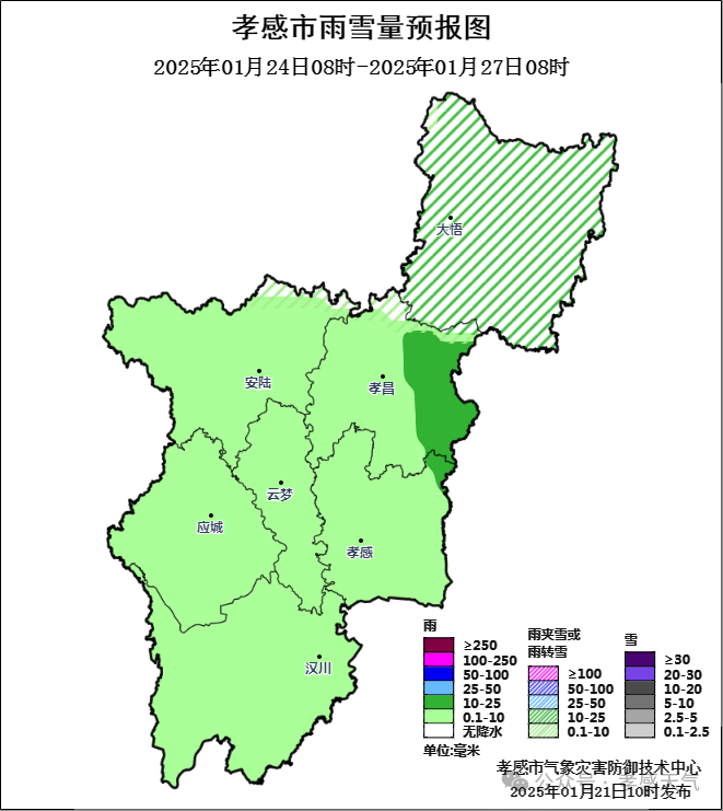 据气象消息,1月24日-26日,孝昌县有寒潮大风和雨雪天气过程。其中24日阴天有小雨,25日阴天有小雨雪,26日雨夹雪或小雪转多云,27日后气温缓慢回升。24日前大气扩散条件较差,空气污染有加重风险。具体预报如下: