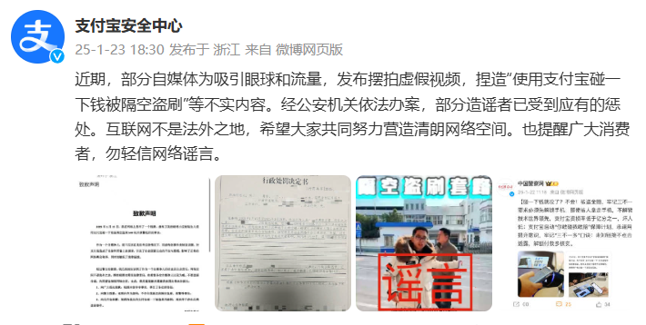 1月23日晚,支付宝安全中心发文称,近期,部分自媒体为吸引眼球和流量,发布摆拍虚假视频,捏造“使用支付宝碰一下钱被隔空盗刷”等不实内容。经公安机关依法办案,部分造谣者已受到应有的惩处。