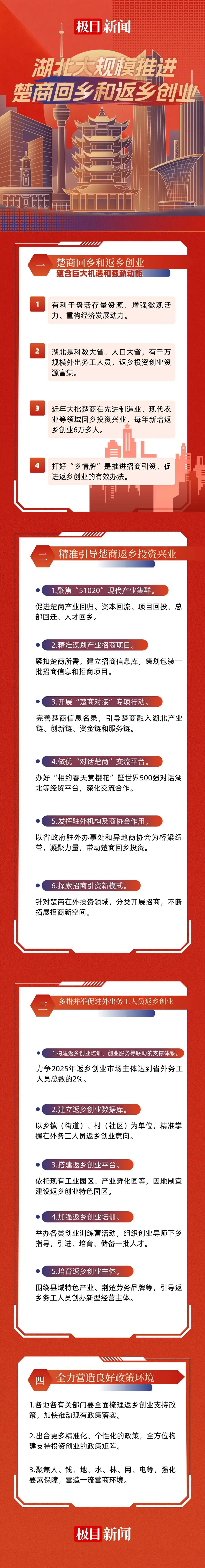 刚刚闭幕的湖北两会提出,2025年,政府将着力推进高质量充分就业,鼓励支持各类创业,面向全省一千多万外出务工经商人员,大规模推进以乡情为纽带的返乡创业的“两增计划”,这些政策备受楚商瞩目。